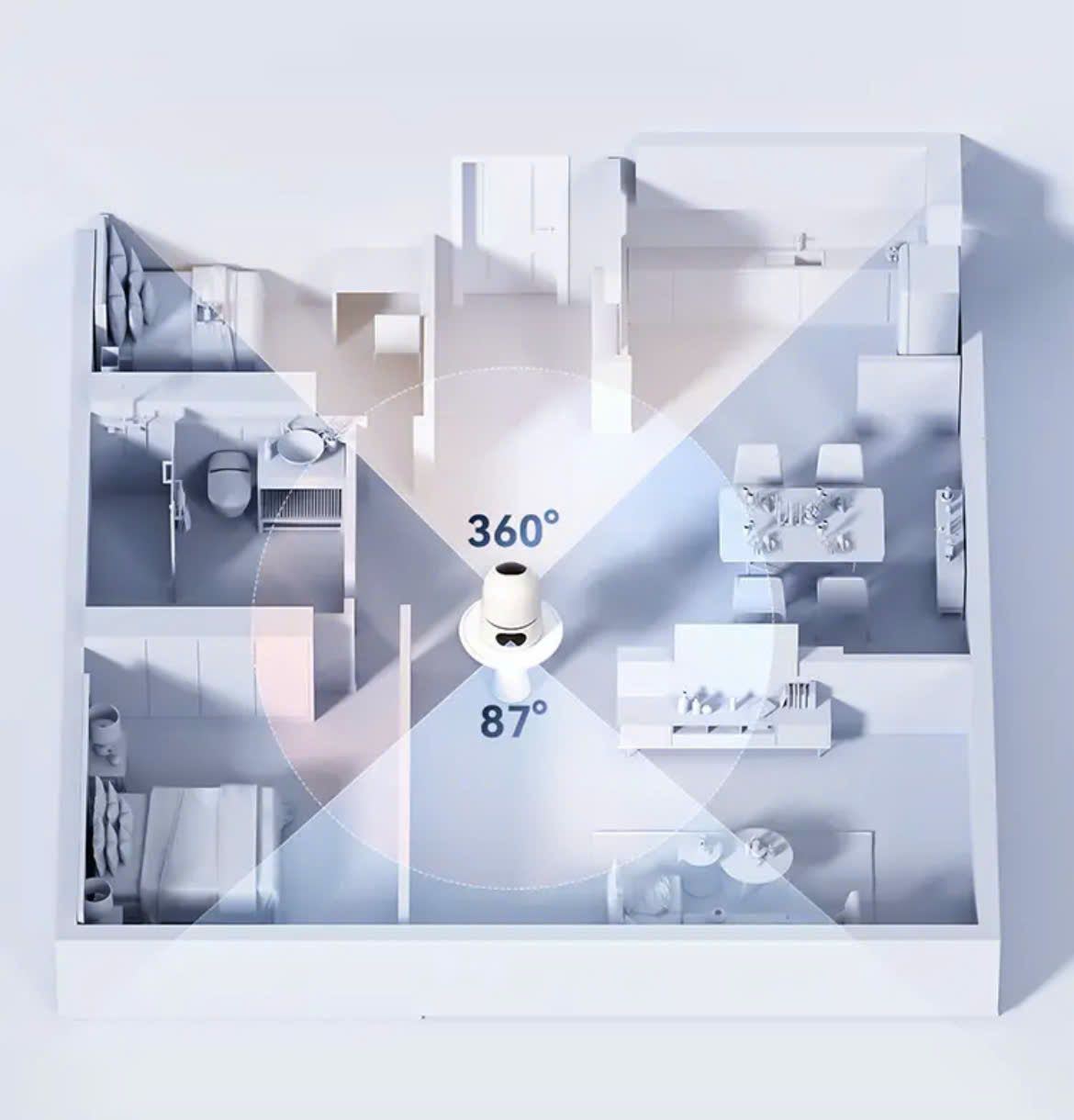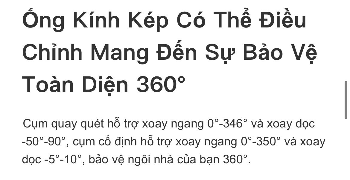 Phạm vi xem ngang của ống kính quay quét phía trên đạt tới 350 độ, cung cấp góc nhìn toàn diện và rộng lớn. Ống kính cố định bên dưới có trường nhìn lên tới 90°, đảm bảo việc giám sát các khu vực chính một cách hiệu quả. Góc điều chỉnh thủ công 10° cho phép người dùng tinh chỉnh và giám sát các khu vực cụ thể một cách linh hoạt và chính xác.