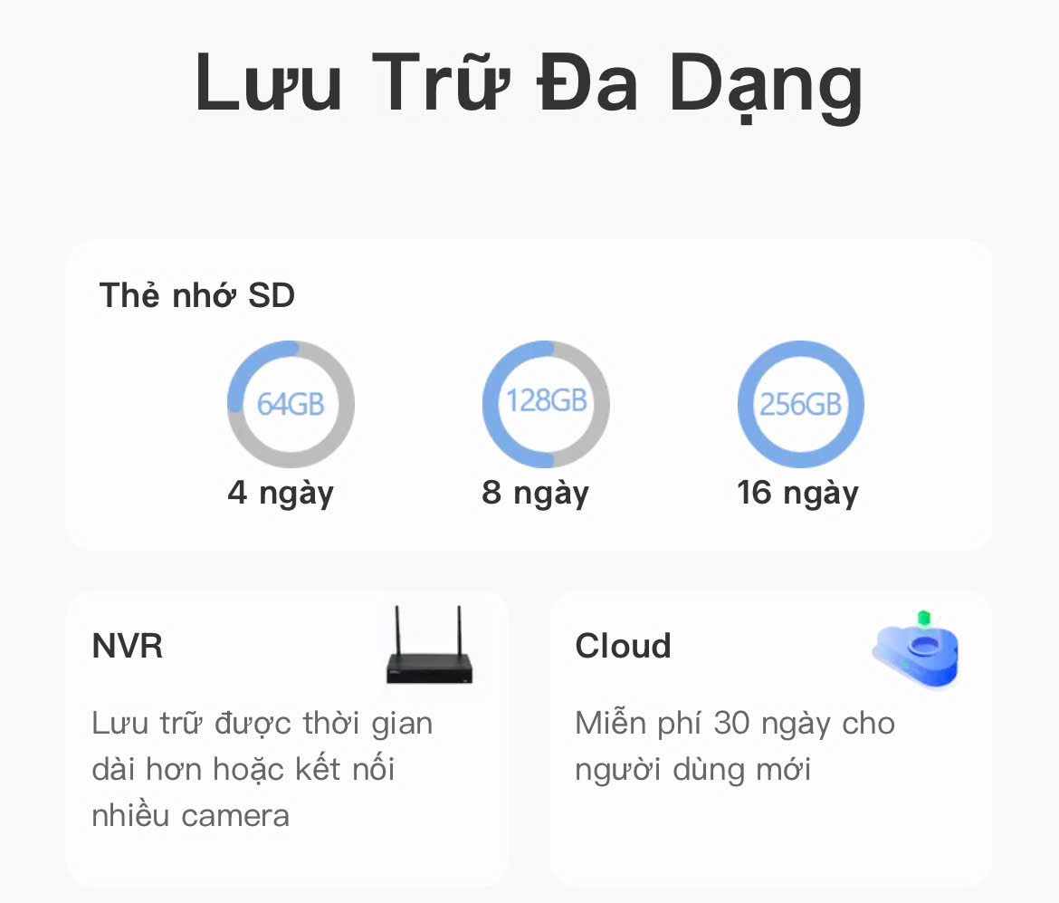 Bạn cũng có thể cài đặt lịch ghi hình, lưu trữ video vào thẻ nhớ hoặc đám mây, chia sẻ quyền xem camera với người khác,…