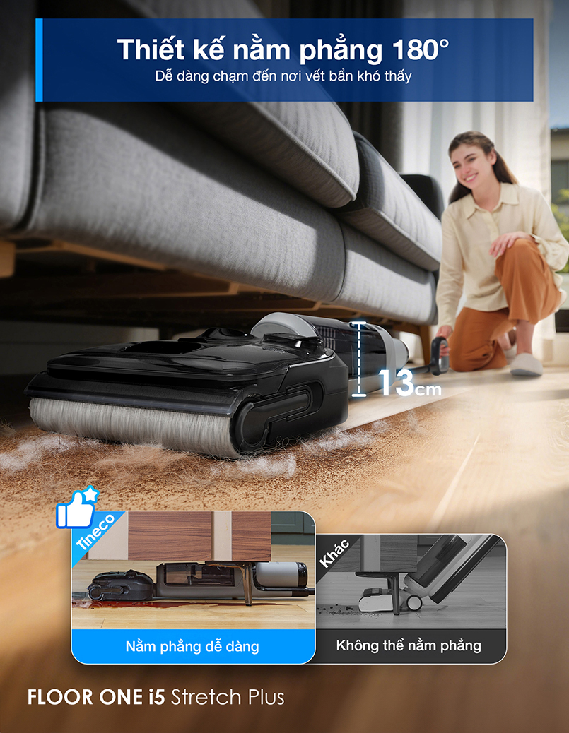 Nhờ công nghệ HyperStretch độc quyền, Tineco Floor One i5 Stretch Plus có thể ngả phẳng 180 độ đột phá. Khi ở trạng thái, máy chỉ cao 13cm, dễ dàng luồn lách vào những khu vực khó tiếp cận như gầm giường, gầm tủ hay sofa,…giúp bạn vệ sinh sâu mọi ngóc ngách dưới gầm nội thất một cách hiệu quả và thuận tiện hơn rất nhiều.