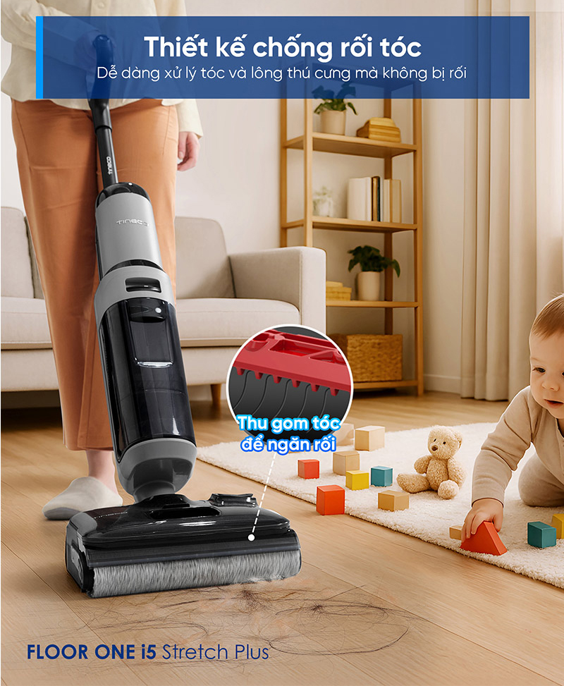 Máy lau sàn hút bụi Tineco i5 Stretch Plus được trang bị thiết kế chống rối tiên tiến, giúp bạn dễ dàng xử lý mọi loại tóc và lông thú cưng mà không lo bị vướng víu, mang đến trải nghiệm làm sạch mượt mà và không bị gián đoạn. Hệ thống răng lược được bố trí ngay phía trước đầu hút sẽ nhẹ nhàng chải và tách các sợi tóc, lông thú ngay khi chúng vừa tiếp xúc. Kết hợp với thiết kế thẳng đứng tạo áp suất đồng đều, máy dễ dàng loại bỏ hiệu quả mọi loại bụi bẩn, tóc và thậm chí cả những sợi tóc ướt. Nhờ vậy, bạn sẽ luôn có một sàn nhà sạch bong mà không còn nỗi lo tắc nghẽn.