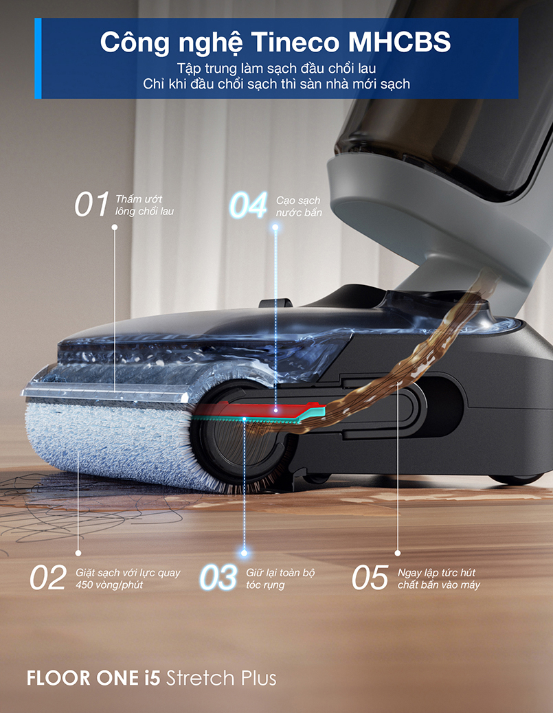 Máy lau sàn Tineco Floor One i5 Stretch Plus được tích hợp hệ thống tự làm sạch chổi liên tục, đảm bảo sàn nhà bạn luôn sạch bong, không còn bụi bẩn hay vệt nước. Công nghệ độc quyền Tineco MHCBS™ này hoạt động với nước áp suất không đổi, liên tục cạo sạch nước bẩn khỏi con lăn, loại bỏ hoàn toàn bụi bẩn. Quá trình làm sạch diễn ra qua 5 giai đoạn ưu việt: