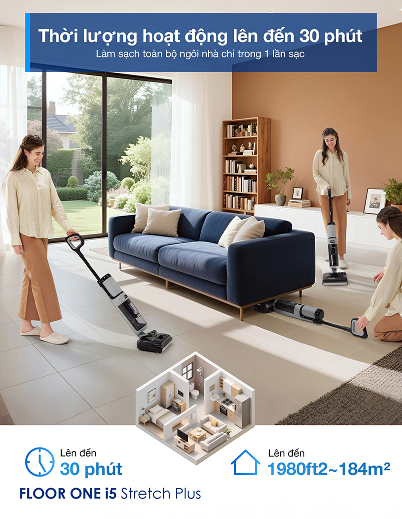 Thời lượng hoạt động máy lau nhà Floor One i5 Stretch Plus lâu dài lên đến 30 phút