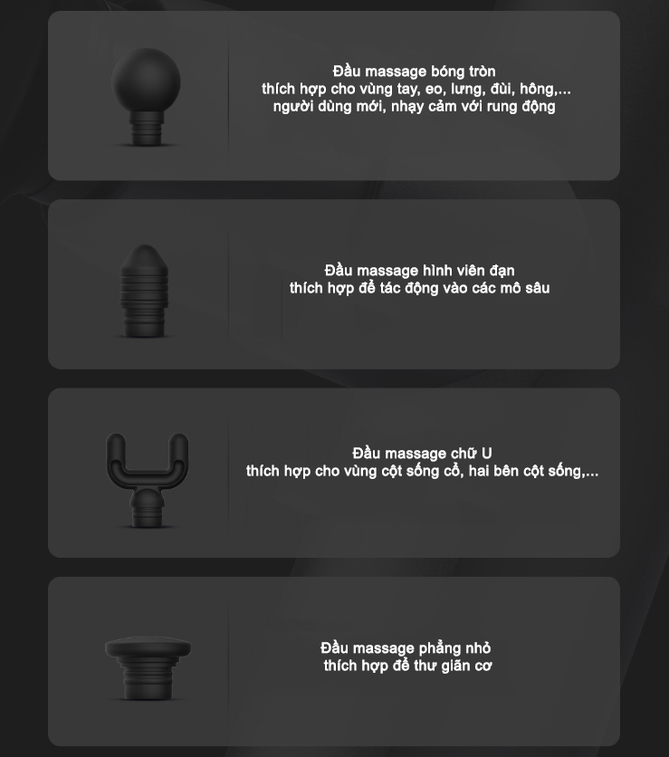 4 đầu massage được trang bị đi kèm bằng vật liệu silicon có độ mềm mại và đàn hồi tốt không chỉ giúp chăm sóc hiệu quả cho các cơ mà còn giúp tránh tổn thương cho cơ và xương khi tác động mạnh. Cụ thể, đầu massage bóng tròn chất liệu mềm mại, thích hợp cho vùng tay, eo, lưng, đùi, hông,…người dùng mới, nhạy cảm với rung động. Đầu massage hình viên đạn phù hợp để tác động vào các mô sâu. Đầu massage chữ U thích hợp cho vùng cột sống cổ, hai bên cột sống, gân Achilles,…Đầu massage phẳng nhỏ thích hợp để thư giãn cơ.
