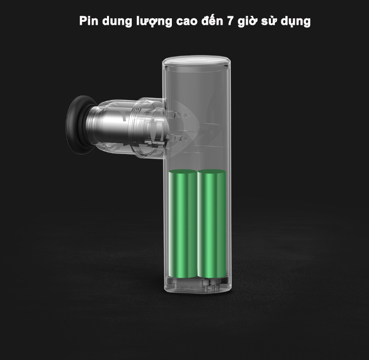 Viên pin dung lượng 1300mAh được trang bị trên chiếc súng massage cầm tay mini này cho thời gian sử dụng lên đến 7 giờ liên tục mà không cần phải sạc lại thường xuyên. Ngăn chứa pin được thiết kế riêng biệt nên nhiệt sinh ra khi máy hoạt động với tần số cao sẽ không được truyền sang pin, không gây nóng, tăng tuổi thọ pin tốt hơn.